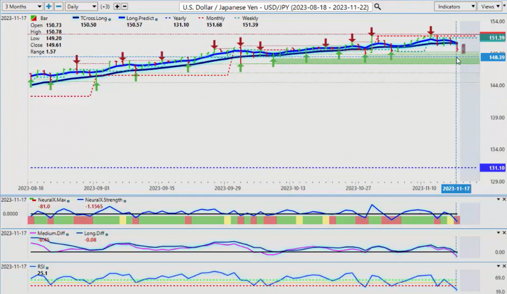 Now, when we look at this from the start of the month, once again, here, guys, we always want to take our Anchor Point from the beginning of the year, and the beginning of the month, the beginning of the quarter, and the beginning of the week. Rolling performance is a lagging model, so when we look at this from the beginning of the month, we’ve used the push from the beginning of the month with the Vantage Point indicators, again confirming that the dollar was going to struggle. Now, that move is accelerated with some of the comments from the Fed this week, some of the economic data, the CPI slightly softer. But again, when we look at this going back into last October, November, the dollar Index did the same thing, even when the Fed was hiking. So, whether he’s hiking or not hiking, the dollar tends to sell off on that seasonal pattern going into year-end.