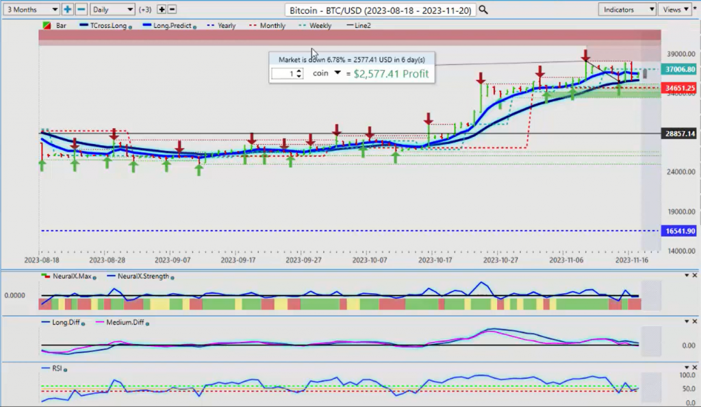 So again, this past week, I was going long and short, but predominantly short because the same signal from Vantage Point that put me long in Bitcoin before this big move happened are the same indicators that are telling me now that this is probably not the time to buy this. So, a very strong seasonal pattern in Bitcoin usually occurs between early to mid-October and early to mid-November, then it backs off a little bit, and then it starts to rally again. So we just want to be patient with this one, but I think that the shorts carry the edge. And again, the AI is very clearly identified the resistance High 37962; we have hit that level twice this week, but we’re also hitting the Vantage Point T cross long at 35517. So that’s what you’ve got to deal with here next week, guys. And if you don’t want to get involved on either side of this, you can straddle the levels that I’ve just said: a buy limit order above 38,000, a sell order below the Vantage Point T cross long, which currently resides at or about the 35,663 Mark.