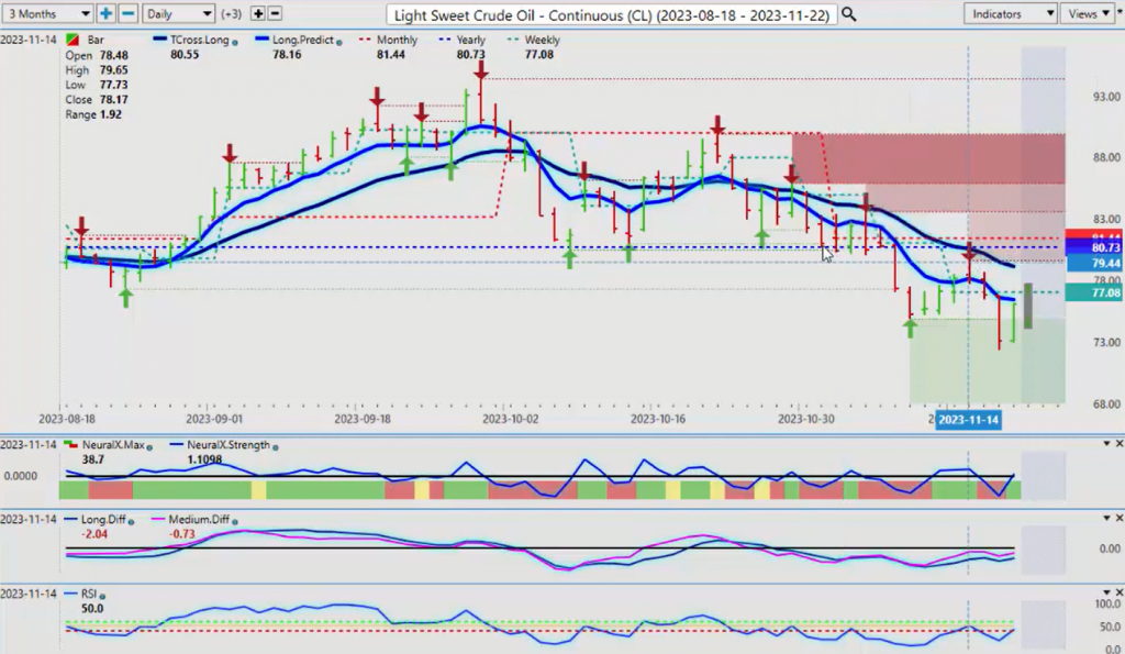 Now again, when we look at going into oil for next week, oil really struggling these last few weeks, and I don’t see a lot of light at the end of the tunnel for this. We’ve broken down again, the importance of using the current monthly and yearly opening price because you can see as we, as we, the battle lines are drawn along the current yearly opening price; the market doesn’t care what occurred 365 days ago or 30 random days ago. It cares about what’s going on in the current year and in the current month and in the current quarter and week. So when we look at this, the retracement back up to the yearly opening price saw yet more selling coming in. But again, we could recover or look for a retracement; the indicators are starting to turn very mildly bullish. But again, this would be a corrective move higher, not a new trend, guys. We’re below our T cross long; we’re below the current yearly opening price at 8073, and more importantly, we’re above the monthly opening price at 8144. So, if we do move higher, we must get past this long predicted at 7646 first before we go anywhere else.