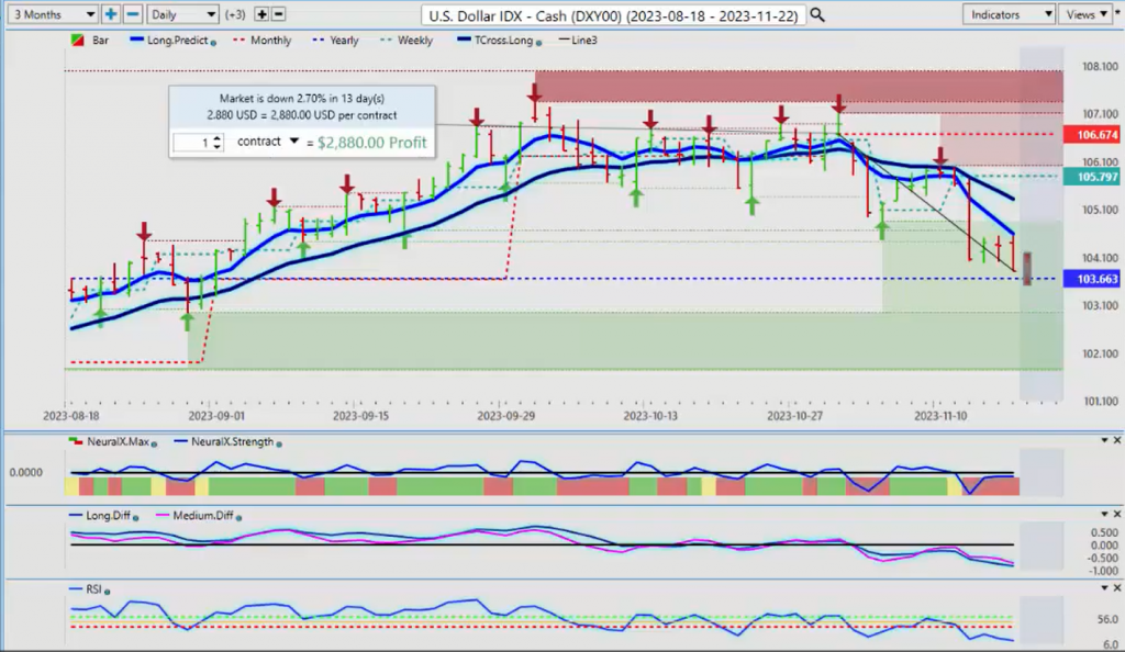 Hello everyone, welcome back. My name is Greg Firman, and this is the Vantage Point AI Market Outlook for the week of November the 20th, 2023. So, to get started this week, let’s begin where we always do, with the US dollar Index.