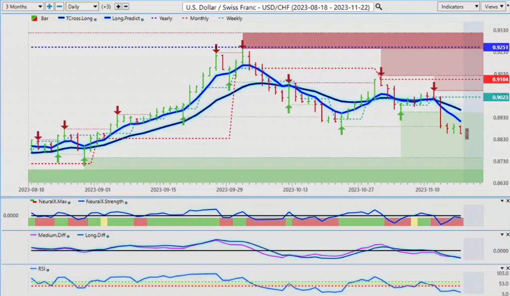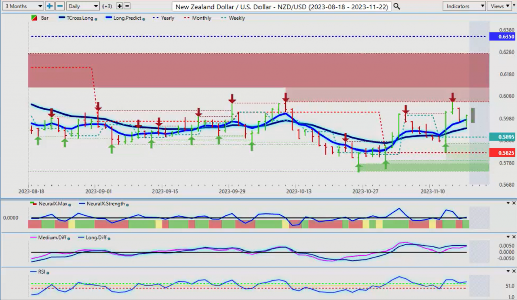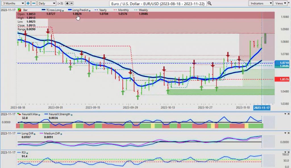 Now when we look at the Euro going into next week, if we’re going to see some type of corrective move on the Euro or some US dollar buying, then we use the verified resistance Zone up here as a target point that is 10945. This is going to be a significant obstacle; be careful of a bull trap up here, okay? Again, we’re pushing a little bit too far away from our T cross long, 10727. 10826, those are our two main predicted moving average pivot levels. So again, the further we move away from there, the more likely it is we’re going to retrace back to them. But because cautious buying up here; the indicators are still moderately bullish, but again, that dollar cycle at the beginning of December is concerning. But everything is starting to pile up on this fed, and I think he’s going to get even more dovish going into 2024. So yes, it does favor more longs on the Euro, but I think a corrective move first to the minimum level of 10826 is likely in the cards.