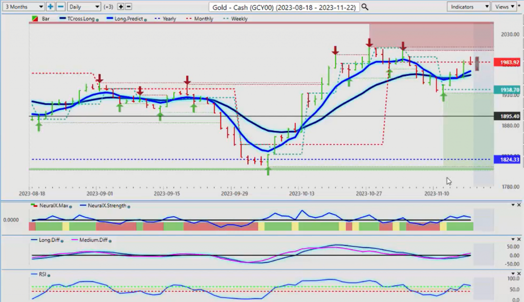I had been clear that the year-seasonal versus the 10-year and the 20-year seasonal have started to shift, and that’s like an exponential moving average or a weighted moving average where I need to look at what the current trends are. That seasonal in gold is shifting forward is what it’s doing, and again, these are things we want to make sure we’re looking very closely at. But for now, we have good support on the TR cross long, and that’s coming in at 1962, but 1983 is where we need to clear this and stay above this. And again, I believe that we’re still a few more weeks away, and we’re likely we could see another slight corrective move lower. But I will concede the Vantage Point indicators are bullish at this particular time.