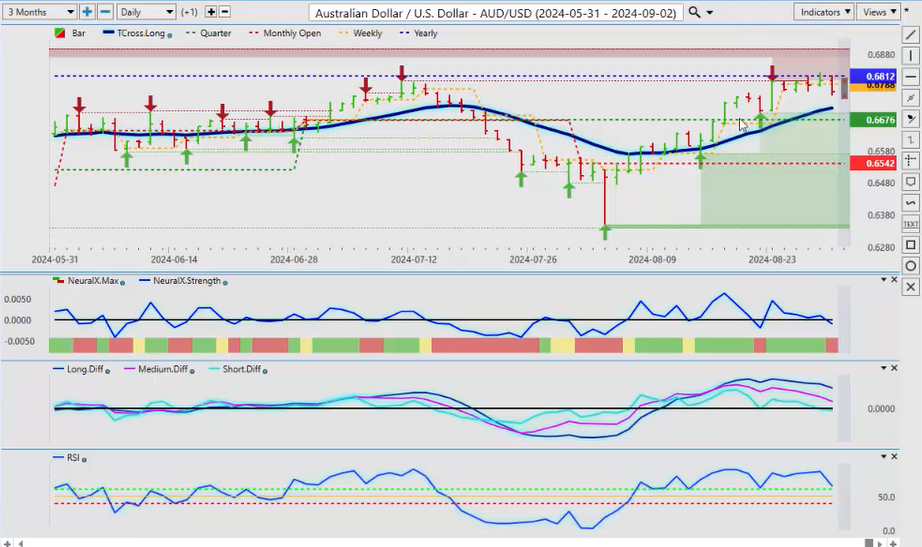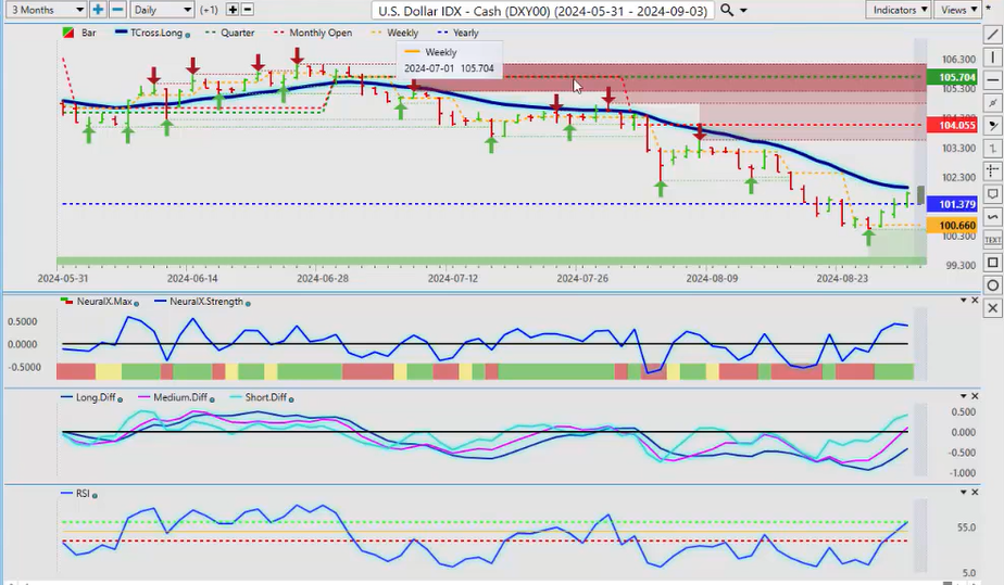Okay, hello everyone, and welcome back. My name is Greg Firman, and this is the Vantage Point AI Market Outlook for the week of September 2nd, 2024. Now, to begin this week, we’ll start where we always do, with that very important US Dollar Index. Now, when we’re trading the Dollar Index in the US fiscal fourth quarter, we want to make sure we’re looking at the current yearly opening price. We don’t want to use a rolling performance model and basically guess at these levels. So, the yearly opening price, depending where you take it from—either the Asian open or the New York session—it’s going to be between the 101 level and 101.43. So, we can see that the Dollar had a pretty good week.