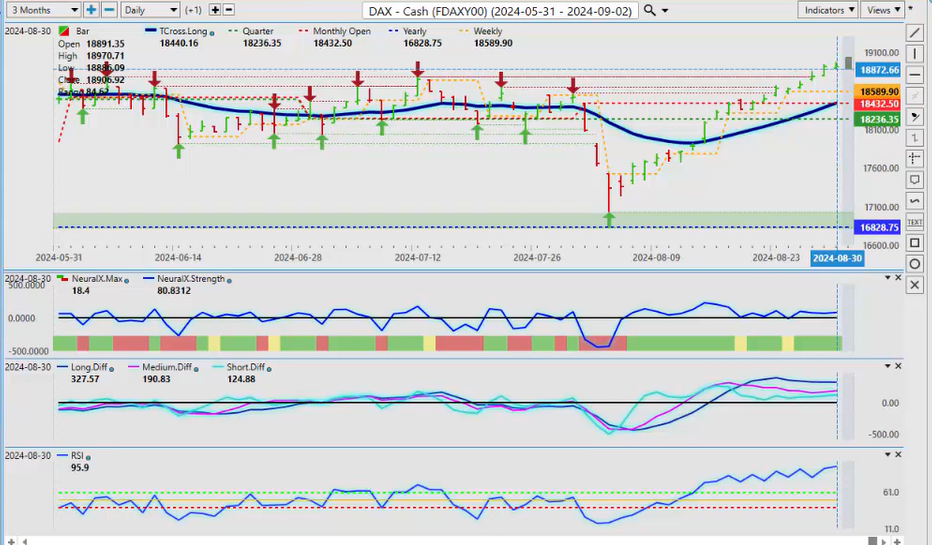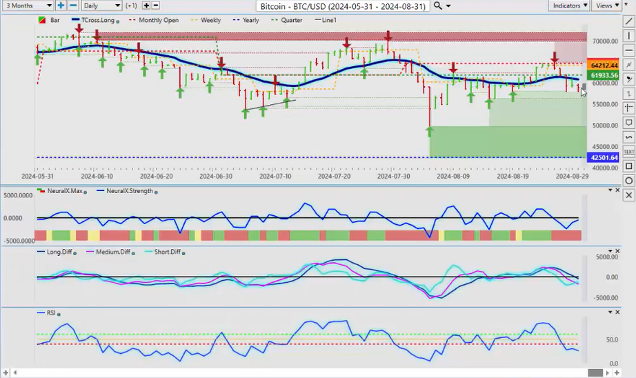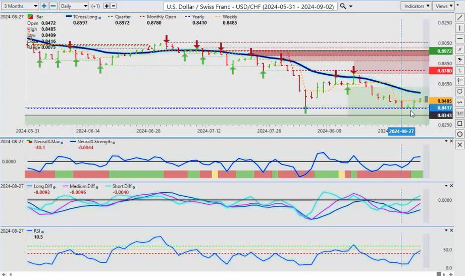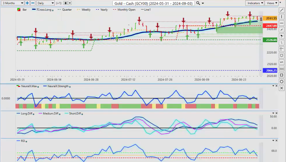 Now, a direct comparative analysis between that and Gold, we can see that Gold had a good month of August, but it’s completely stalling out on these verified zones: 2529, 2527. No new highs here from these two particular levels. And as we can see, we have an MA diff cross right here: the medium-term crossover versus the long-term crossover, or the strength of the medium-term trend has actually been weakening since August 20th. We’ve had a retracement back up to that level, failed again. So what I would be looking for in the month of September is for Gold to break down below the T cross long at $2485, but then we would look to rebuy those Gold contracts into year-end after October 1st. So again, the predicted differences are showing we are losing momentum in Gold; predicted RSI moving down; neural index, neural index strength—we just need again to break down below that T cross long to confirm this. And I will stress that, but the new monthly opening price, uh, for the month of September, that is likely going to be around 2503, so it’s going to be very difficult for Gold to hold above this level if we get that Dollar strength.