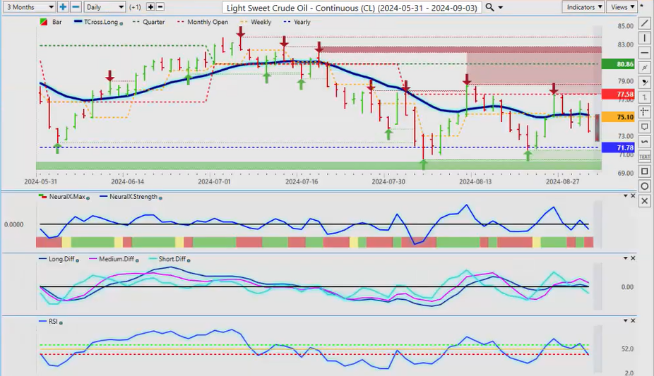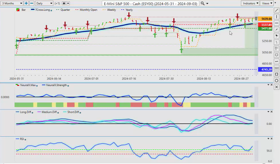 Now, with the equity markets, looking at the S&P 500, this chart looks very, very similar to the Gold contracts. But once again, we have a medium-term crossover on the equity markets that is trying to complete here. So, I don’t anticipate a great month for equities in September, but in the year-end, they should be fine. We just have to determine whether is the US going to go into a full-on recession, a partial recession? Uh, we will have to see that, and we will monitor the Fed’s comments. But right now, the FED is basically telling us he’s going to cut in September. Now, that may initially help stocks, but the longer-term view of that, the FED may also say the economy is weakening, that will not help stocks. But by the indicators, basically in VP, we have been losing momentum since August 20th, the exact same day that we saw Gold pulling back. So we’re not making new highs in the equities of any real amount, slightly new high over here on August 26 at 5651, but nothing since then. So, a breakdown below our T cross long, that is coming in at 5552, should send the equity markets lower based on the current indicators. But we need to complete that medium-term crossover, and we do have momentum building back to the upside on the predicted RSI. So, it will be very interesting to see how this one plays out if we can actually, if the equity markets can fight off the Fed, the stronger Dollar, all of these different factors that play into inter-market correlations.