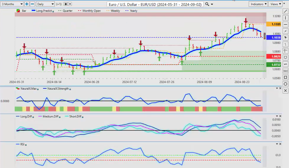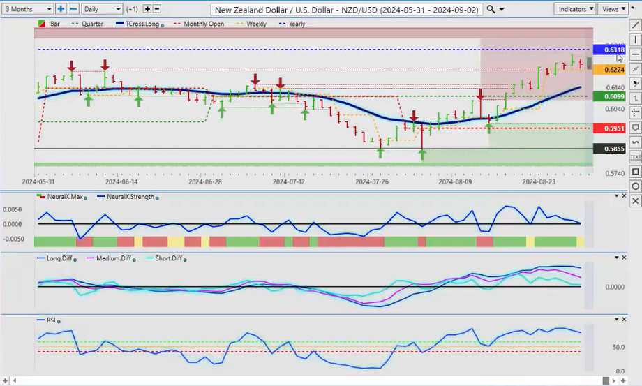 This Dollar cycle that I’ve talked about over the many years of doing these outlooks is there is predominant Dollar buying in the first week at the end of the month into the first week of the new month. Now, there’s also a very strong seasonal pattern of Dollar buying in the US fiscal fourth quarter, which will end October 1st. So, right now we can see that the Vantage Point indicators are clearly picking up on this: the predicted differences, the neural index, the neural index strength, and we’re gaining momentum on the predicted RSI at 60.2.