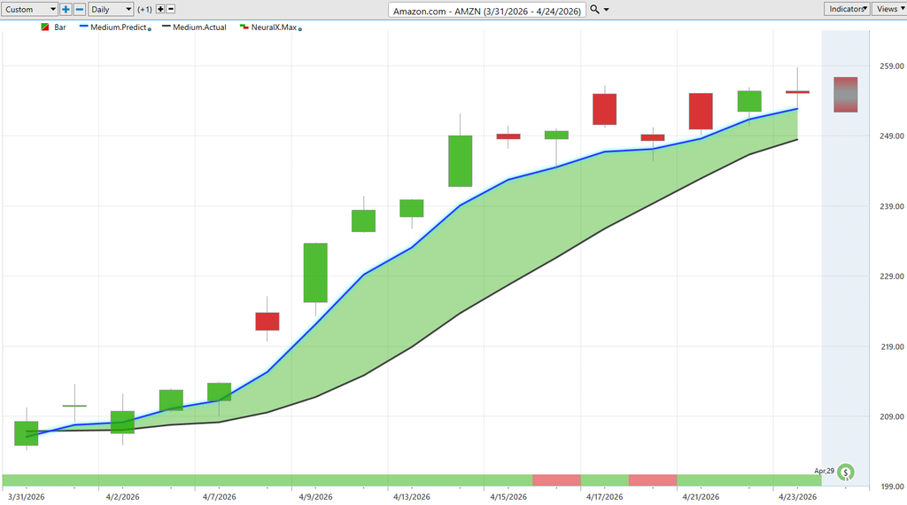 So very exciting stuff here uh but we can apply this to individual stocks. So here’s shares of Amazon and you see a very similar picture. We start to see the market turn up. You’re likely to see these big names uh inside of the index start to go higher as well. But this is where VantagePoint’s allowing traders to really fine-tune these entries into the market. And you see here, here’s Amazon actually on Monday, scooting right down to that predicted low and immediately continuing this uptrend, moving up towards predicted highs. Uh, and again, offering a potentially very nice entry from the beginning of the month to add more to the position or potentially a day trade where you’re buying at the predicted low, targeting these short-term predicted highs. Uh, and sort of a rinse repeat behavior here. uh taking these pieces out of the market. So really exciting stuff here from Amazon. Really seeing how these trends continue, but also how you can manage and adapt to these changing situations uh and benefit off of the highly accurate predictive forecasting ability of these artificial neural networks specifically utilizing that intermarket analysis and generating these predictions.
