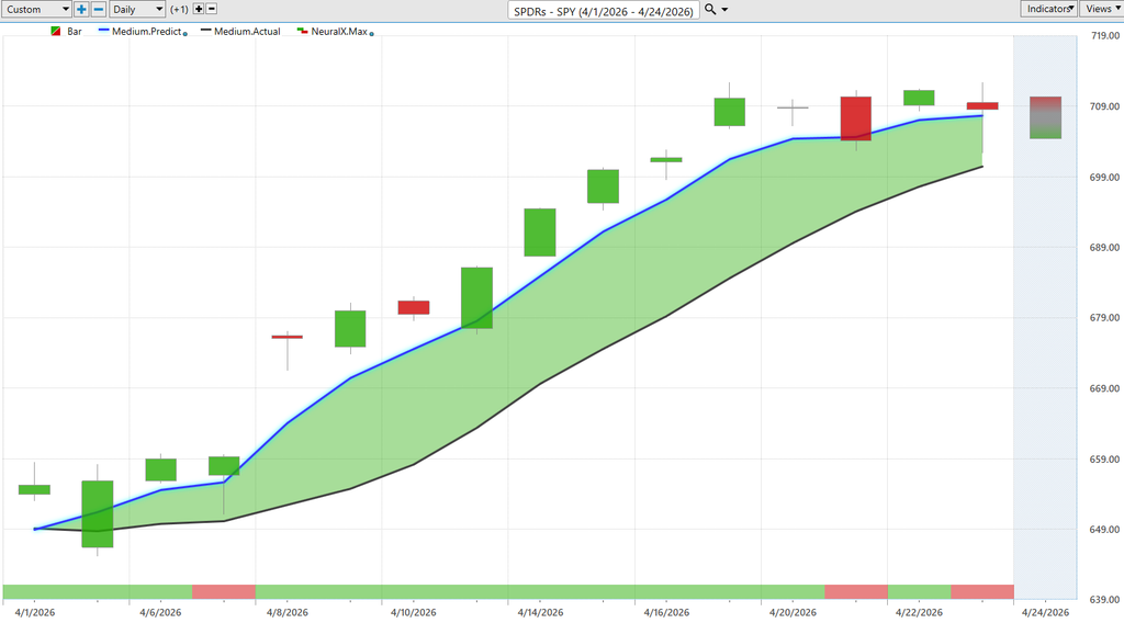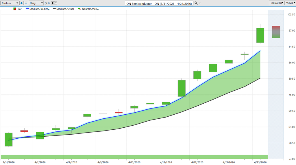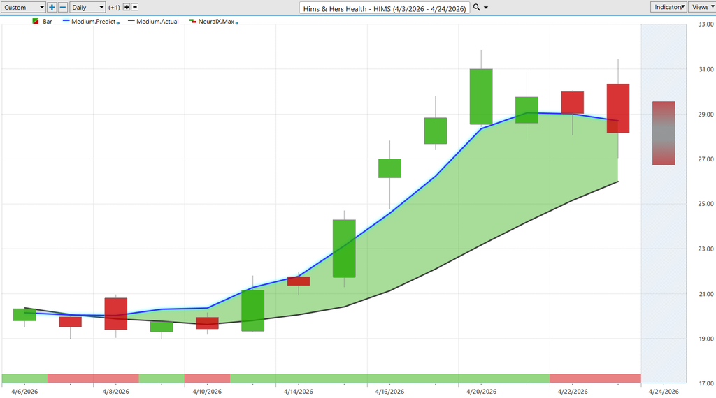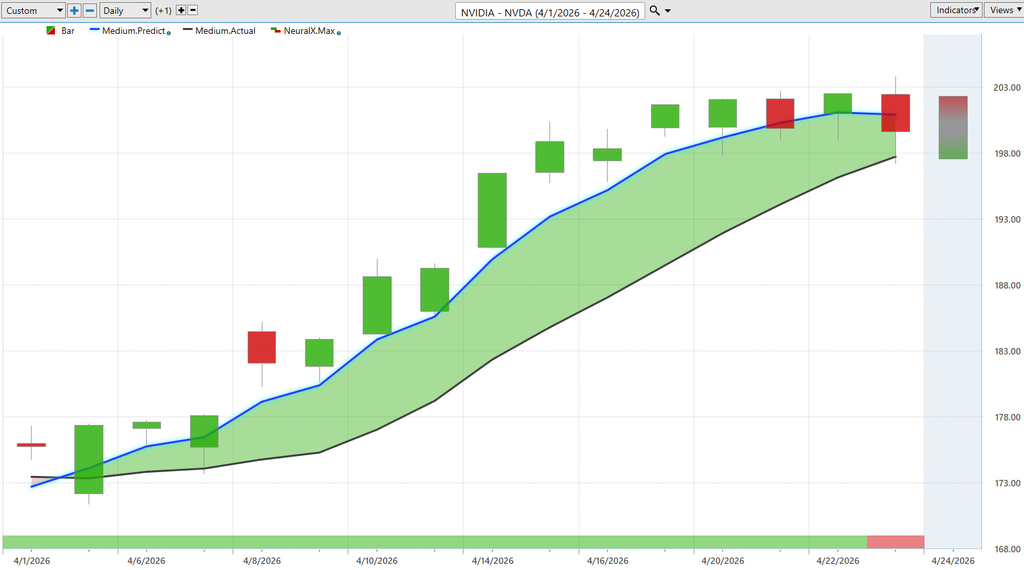And lastly here just ending on Nvidia of course uh making this about as clear as possible. Blue line over black line. This is really what’s so effective about this is VantagePoints and Intelliscan features can really be tuned to say Hey where are those high volume stocks where we are seeing the predicted moving average create a fresh signal. and we just see again Nvidia, SPY, Amazon the cues and that can drive you to saying hey let’s go ahead and look for these choice opportunities potentially focus on these you know tech stocks and semiconductor opportunities. And really seeing those outsized gains as it makes sense to take some shots here and be on the bullish side of the market well no different here in Nvidia, but obviously a much more mature opportunity, mature stock here, up about 13 – 14% over the past couple of weeks. Very respectable. But being able to really fine-tune that, right? So, saying, look, you can maybe build a larger position uh because you don’t have to risk as much when you have a tool that’s extremely accurate uh at forecasting those short-term price movements uh and uh really adjustments made day-to-day in the stock. So again, great opportunities all over the place and some of these really extreme like Hims and Hers Health, On Semiconductor. There are numerous names out there that again are up you know upwards of 50 60% just in the month of April here. So with that we’ll go ahead and leave it there for today. But once again this has been our Hot Stocks Outlook for April 24th 2026. Thank you all for watching.