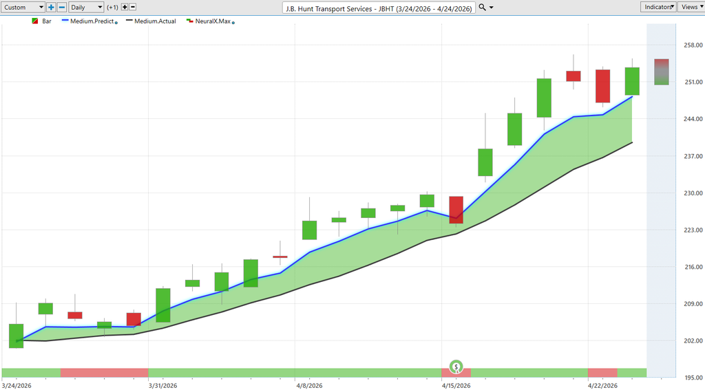 Here’s JB Hunt Transportation Services. Well, here we go. Blue line over black line. Notice that Neuralindex goes bearish and you settle out for a couple days, but the last thing you want to be doing is sort of freaking out here as the market’s not really moving. Not really moving. Maybe starts to sell off a little intraday. But the overall trend here is bullish. Uh, and we see shares pretty aggressively moving higher here, constantly bouncing off of these vantage point predicted low after predicted low after predicted low. Here’s earnings. I always like to bring things like this through because, you know, the software obviously doesn’t know what the earnings report numbers are going to be. But when you’re getting entries at a really nice uh, uh, entry price, you can often again take on some of that risk, and volatility. And oftent times that works in your favor and you see shares really responding to that the volume coming and things going aggressively higher here. So uh once again overall got a very nice move here 23 plus%.