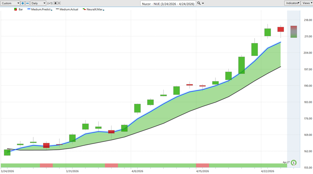 Here’s Nucor ($NUE). So we’ve seen a steel manufacturer see like cliffs natural resources. Here’s new core blue line over black line. Neural index bullish here. You see we get uh the neural index bearish. You get the sideways price action. Here’s one day where you could say I guess it’s incorrect because we didn’t get any weakness. But clearly it’s telling us the uptrend is is bullish here. you’d only want to go long, take profits on longs. Uh, and we see shares continuing to advance here. And of course the predicted highs and lows getting down to that minutia of intraday price action where you might want to scoop up some shares. And what makes this simple is you can just set limit orders into the market, right? If you say, “Okay, I want to be long this market. Maybe you already have an existing position, but you want to make sure that you manage it effectively.” And this is probably one of the strongest cases for these artificial neural networks is their ability to adapt. So we saw that, you know, the broader stock market go this huge sell-off, everyone sort of freaking out, uh, responding to a lot of these geopolitical situations going on. And in the background, there’s some monster trading opportunities opening up, offering, you know, 30 to upwards of 100 plus percent on many of these opportunities. Here you see 29% in $NUE just in 21 trading days. We see now earnings coming up and really giving you that cushion potentially to take on that earnings risk. Potentially see this trend continue higher.