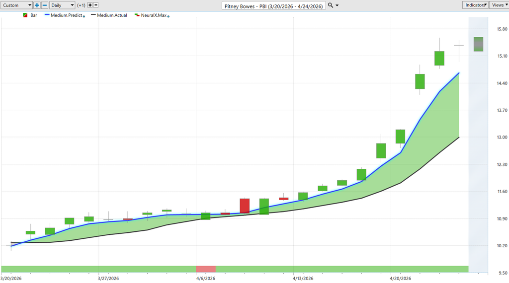 Here’s Pittney Bowees, PBI, very good example of this blue line crossing above the black line. We have this one trading day here where that neural index goes bearish. And look at the subsequent 48 hour price action, right? We’re in a strong trend, grinding higher each day. Neural index goes bearish. We run sideways for a couple days but almost immediately reverts back to the bullish side and then we see this momentum really kick into the share price. And of course the daily predicted highs and lows. So you have a road map and it really makes doing technical analysis quite simple is really all the heavy lifting here is handled for you. Now the beauty of this is we can actually apply this to VantagePoint scanning features. So actually use these predictive indicators to highlight where fresh signals are coming through. And look how many opportunities here we are scooting right down to the predicted low and pretty much immediately within 48 hours trading considerably higher and outside of that previous range. So again really nice move here in shares of PBI. And again seeing things actually fairly broad base spread out but you need to be in the right names here. Uh here we see up about 46 47% in just 23 trading days. So, we’ve had just some monster moves here uh in April and that’s again where we see the indices turn up and where we see a lot of stocks performing quite well.