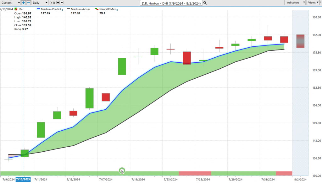 This is a good example, and D.R. Horton ($DHI) here really is probably the best example of where we saw a lot of the material and construction stocks turn higher. That was really the entry. If we go back and watch the Hot Stocks Outlooks from about four weeks ago, this is where we started to see IWM, a lot of the small-cap stocks, turn higher. But now it looks like a lot of this is being overcome by just the overall weakness that’s coming in via the SPYs and the Qs, and it’s really dragging just about everything lower outside of some of these really choice areas of the market. But this may even be susceptible as we see that neural index go bearish, and we are seeing again a lot of market weakness in some of those smaller-cap stocks that were doing really quite well here. D.R. Horton, we can notice here is that the market hasn’t collapsed like the broader market of stocks like we see with Microsoft and the Qs and the tech space. You also see the market just running sideways and look at these predicted lows just day after day giving you really nice opportunities to take a little piece out of the market, minimize your risk, and stay involved here. Really nice rally again in shares of D.R. Horton, but we really want to recognize these things really several weeks ago, really at the beginning of July, leading to a nice month in these construction shares.