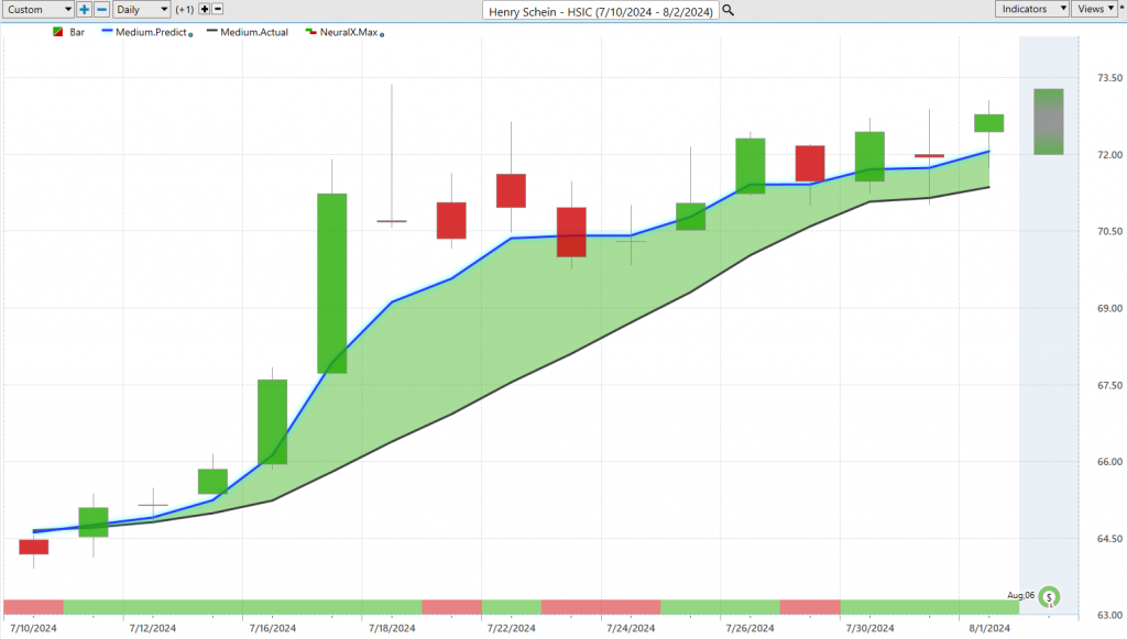 Henry Schein ($HSIC) had been really beaten down. You see this blue line crossing above the black line offering a really nice opportunity to get involved. Again, few and far between as far as some of these areas in the marketplace, but we can use VantagePoint’s predicted highs and lows to manage these things every day. Understanding this is in an uptrend, as a trader, we may want to look down towards these predicted lows and participate in this bullish rally. Again, we can still go ahead and take a look at the overall move here. Just over the past 15 trading days, you’ve got another 11-12% move to the bullish side.