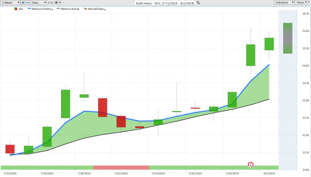 Now, there have been really exciting opportunities, but they are a little few. Kraft Heinz ($KHC) is far between. A really good example here in shares of Kraft Heinz, we got a really nice reaction after earnings, but this has been a stock where we actually see that blue line cross above the black line, neural index get bullish, and this is actually a good time to go ahead and explain this bar at the bottom of the chart here. You see this bar that goes from green to red back to green. Just like the predicted moving averages and our predicted highs and lows, traders have to solve different problems that may be attached to different time frames. When we look at the predicted neural index, this is actually an extremely accurate indicator with upwards of 86% accuracy predicting short-term strength or weakness over the next two trading days. So, we can think of that as very short-term strength or weakness. It really gets you ahead of some of those declines and consolidations in the marketplace. This is a really great example of this where you see in Kraft Heinz you see where that neural index goes bearish and you get these subsequent days where the market is moving well below that predicted moving average, moving down towards the VantagePoint predicted highs and lows that we highlighted. This gets traders ahead and understands there’s likely to be some weakness here, but the overall trend is up. As we see that neural index get bullish once again, the momentum picks up, and we see that nice move in the marketplace in shares of Kraft Heinz. Like I mentioned, there are not a lot of bullish areas in the market when we start to see the broader indices go lower. You see about a 10% rally here just in the past 14 trading days, but certainly many of these opportunities want to be trailing stops, staying defensive if not hedged on the bearish side, seeing so much of this weakness.