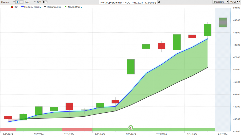 Now, we looked at the defense and aerospace Northrop Grumman ($NOC) ETF last week. That really lets you know that, just like with those home building stocks and things like BLDR, which had a really fantastic rally over the past month, here in Northrop Grumman we have a similar situation where that blue line crossing above the black line, you’ll see that neural index go bearish, and you do get some subsequent sideways price action. Again, as that momentum comes back into the market, we really start to see shares accelerate. You’re seeing a lot of just event-driven news here. This is something where these defense stocks are certainly going to be determined by things going on all throughout the world. Here you see about a 13.5% rally, and really doing quite the opposite of what we’re seeing in many of those tech stocks. If you want those areas to be bullish and conversely have some areas where you may want to hedge and get on the bearish side, it becomes quite simple to use VantagePoint’s predictive indicators and find where those very strong forecasts are, whether they be to the bullish or bearish side. Really nice opportunity there, really nice entry as we see things accelerating to the bullish side.