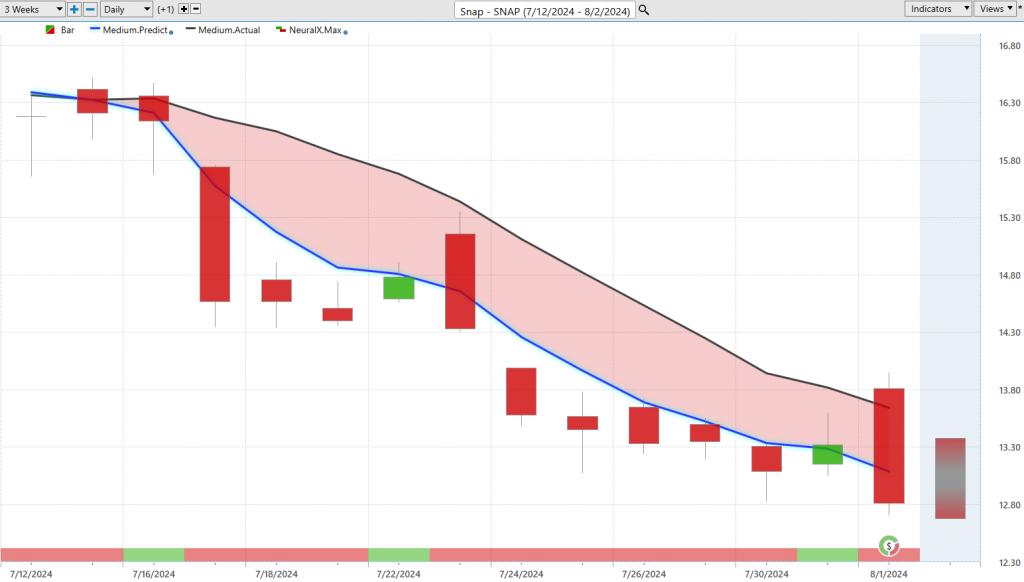 Now, here’s shares of Snapchat ($SNAP). The tech space and this is really the broader theme that’s playing out right now. Here we see this blue line crossing below the black line. We see again Microsoft, the Qs. I mean you can pick your tech stock where the forecast looks the best and maybe where you can get that short-term entry via the predicted highs and lows, but everything looks very, very weak here. Of course, we can look at VantagePoint’s predicted highs and lows and get a sense of how these tools can help you. You see very early, getting almost a perfect entry as that market moves up towards the predicted low then declines. You see a little bit of volatility here, things gapping around, but look at this level, these two predicted highs that were never hit. The market gaps up, and then the resumption of that downtrend, and we just see more and more weakness. You get that noise around earnings but just gapping up and pretty intensely going lower very, very quickly here. Overall, we’ve got a really nice movement lower here, a really aggressive movement lower about 21% in shares of Snapchat in just the past 13 trading days. When you recognize that broader weakness that we see in the Qs and see in Microsoft, you can really pick your spots and say, okay, how can you get exposure to this theme of tech weakness that we’re seeing, and find the best places to go ahead and do that.