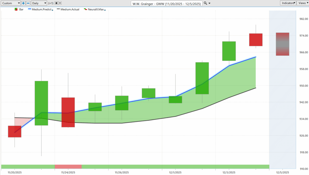 Predicted lows highlighted clear buy-zone opportunities. GWW has moved about 3–4% higher during this period.