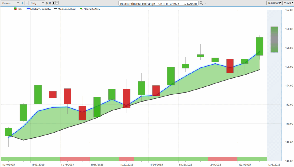 The blue line is calculated using artificial neural networks performing intermarket analysis. Instead of looking only at past prices of ICE, the system analyzes dozens of correlated markets—other stocks, ETFs, global interest rates, major currencies, and even certain commodities. These intermarket relationships drive the future price of ICE.