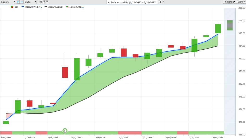 Now, moving on to AbbVie Inc. ($ABBV)—another strong trend where the predicted moving average crossed above the actual moving average. Even though the neural index occasionally flipped bearish, we saw only short-term sideways price action before the uptrend resumed. After earnings, AbbVie ($ABBV) has rallied about 15%, and the predictive indicators have remained very accurate in forecasting key price levels.