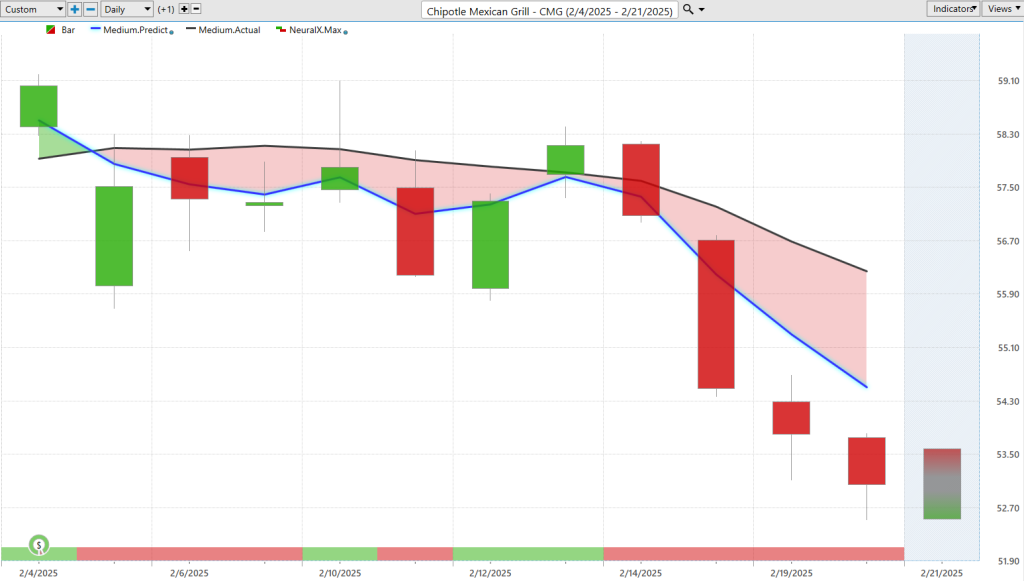 Next, let’s look at Quest Diagnostics ($DGX). This is another great example of how all of these predictive tools work together. The blue line crossed above the black line, the neural index remained mostly bullish, and despite some short-term fluctuations around earnings, the overall trend remained to the upside. Over the past 19 trading days, shares are up 12%, and again, the predicted highs and lows have provided excellent guidance for entry and profit-taking.