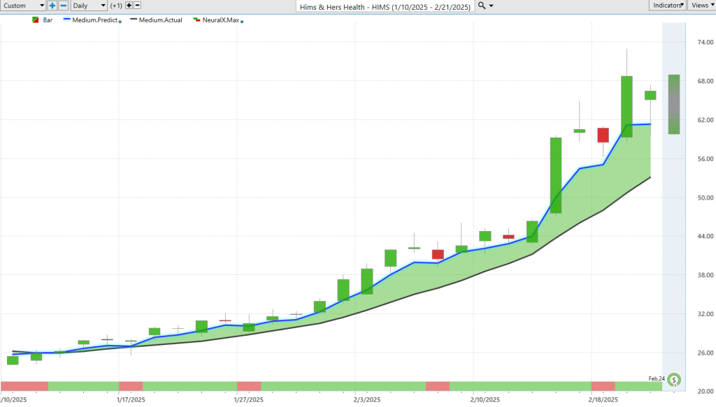 Now, here’s Hims & Hers Health ($HIMS), which has been on a huge rally. If we look back at the forecast, we saw the blue line crossing above the black line in mid-January, and ever since, we’ve had a very strong bullish trend. Even though the neural index turned bearish at times, the blue line remained well above the black line, keeping the overall forecast bullish.