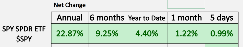Now, as we typically start out, we can take a look at the SPY ETF just to get a sense of where the broader equity indices are. Year to date, we’re still up about 4.4%, not really changing much from last week. Again, over the past 30 days, we’ve been creeping up about 1.2%. So there have been a lot of great opportunities out there, but also a really mixed nature to the market—you want to be involved in the right opportunities.