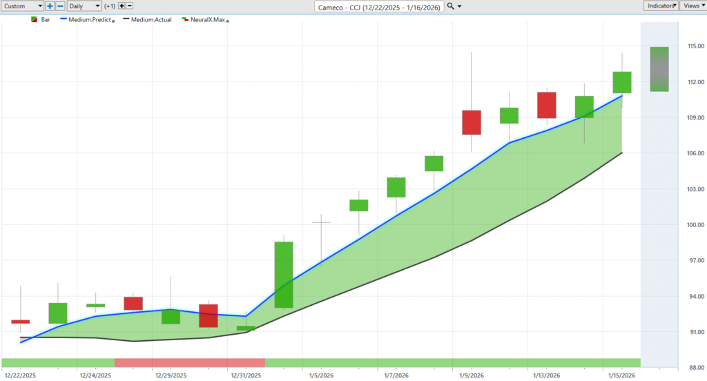 It is really using the data sets of dozens of other markets that are known to drive and influence future price of this specific stock, this target market, $CCJ. Now, that can be things like other individual stocks spread across the marketplace. That can also be ETF groups. But it even looks at things like commodity futures markets, things like currencies, things like interest rates in the bond market, as well as again global commodities where applicable, and may certainly be applicable in shares of something like $CCJ.
