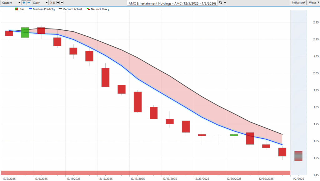 Um, and now we can just pivot to some of the weakness in the market. So, uh, here’s AMC Entertainment Holdings, and it doesn’t get much more bearish than this. Here you see this blue line crossing below the black line, neural index just saying expect this market to just keep going lower, day after day after day. Uh, and of course our predicted high and low ranges will also assist with that, saying, look, expect the range to start slanting lower here.