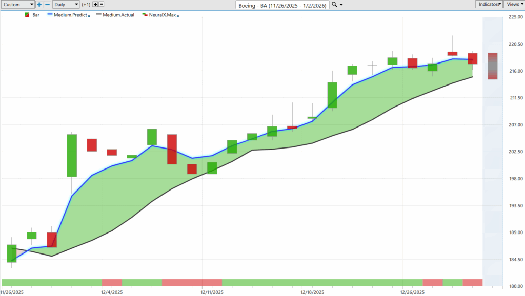 Again, we see that neural index going bearish after this little up day. Uh, and we see we’ve really just kind of run sideways here for the past few trading days, but overall the trend still bullish here. And so, nice move so far out of, uh, Boeing, but that’s, again, not the entirety of these predictive tools. You’re also provided a predicted high and a predicted low range. So, this is where things get very exciting for, uh, position and short-term day traders.