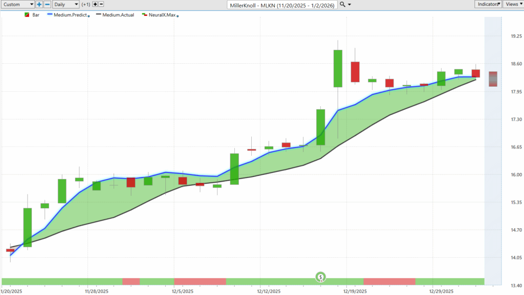 Of course, traders can combine that with the Vantage Point predicted highs and lows and get a really nice road map here of, okay, well, when are we getting down to those very advantageous levels to take a position, uh, and exploit that bullish trend that’s playing out in the market. So, here in Miller Knoll, uh, seeing a very nice move here over the past few weeks, about a 22% rally over 26 trading days.