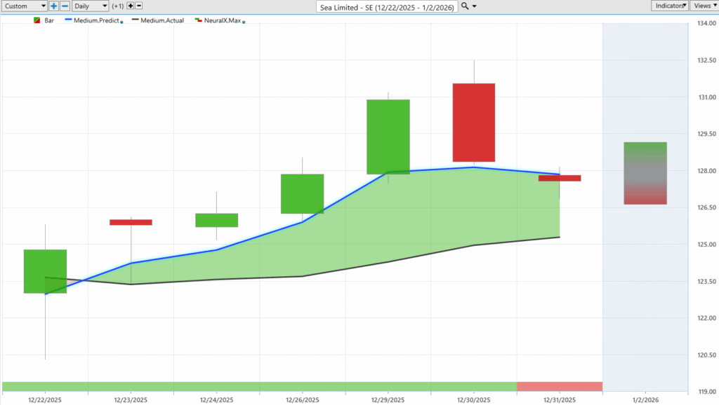 So, again, during that 40% rally, you know, a good eight and 10 positions, uh, moving on to the upside and continuing that uptrend. Uh, now here’s a new opportunity and notice a lot of strength in some of the international stocks. So here’s $SE. Uh, we see about five, six trading days ago getting that blue line crossing above the black line, uh, neural index very bullish here, and a lot of separation between that blue line and the predicted moving average and the actual moving average. Uh, and more recently getting this consolidation, market moving back towards these predicted lows, and sure enough today we’re seeing a very strong move higher, uh, again here in SE.