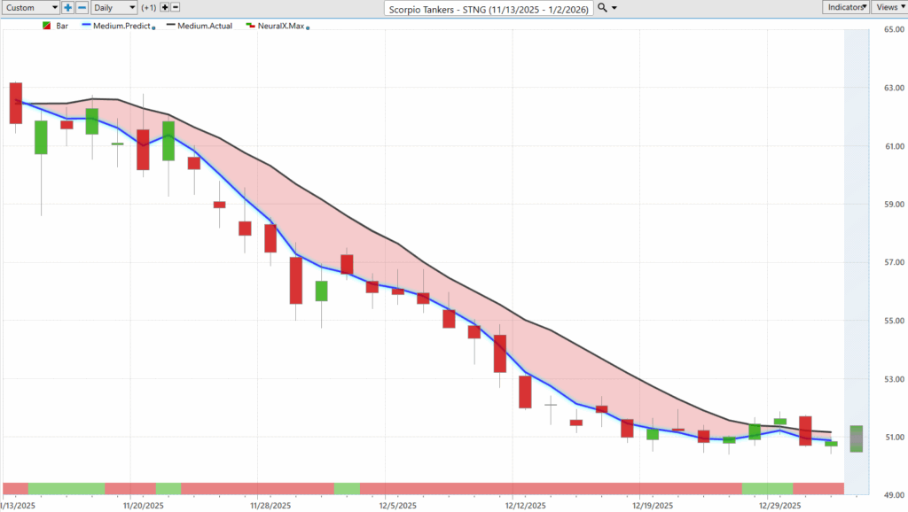 If we move up towards these predicted high levels, well, that’s an area to actually short, uh, and take profit on some short opportunities. Uh, you see this getting very, very beaten down here, down about a $150 a share, uh, after another 32% decline here just in the past 17 trading days. Also, energies have been quite weak, uh, both on the commodity side and these individual stocks, and here’s Scorpio tankers. Very similar situation here, and a good example of really the conflict between the indicators here, where we see the trend is going lower, but notice the neural index is bullish.