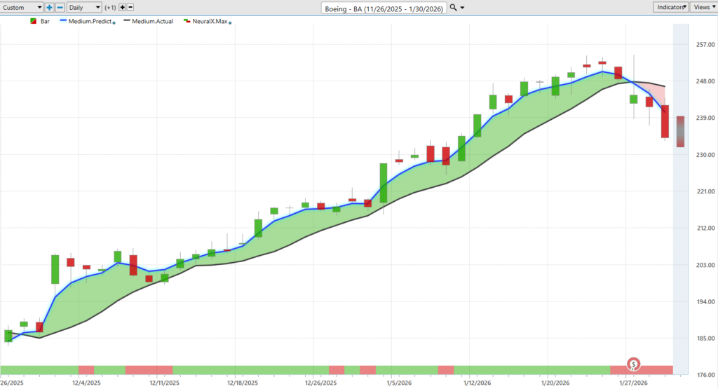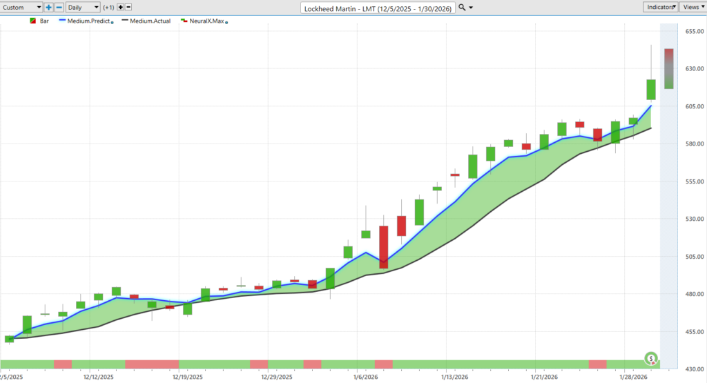 Martin, which is very correlated here to Boeing. We’re seeing a lot of just, you know, similar moves day to day. But here we see that blue line getting above the black line. Notice these periods where the neural index goes bearish. It tends to just run a little bit sideways for the next couple of trading days. But as long as that blue line is above the black line, you’d expect the overall trend to still be in an uptrend.