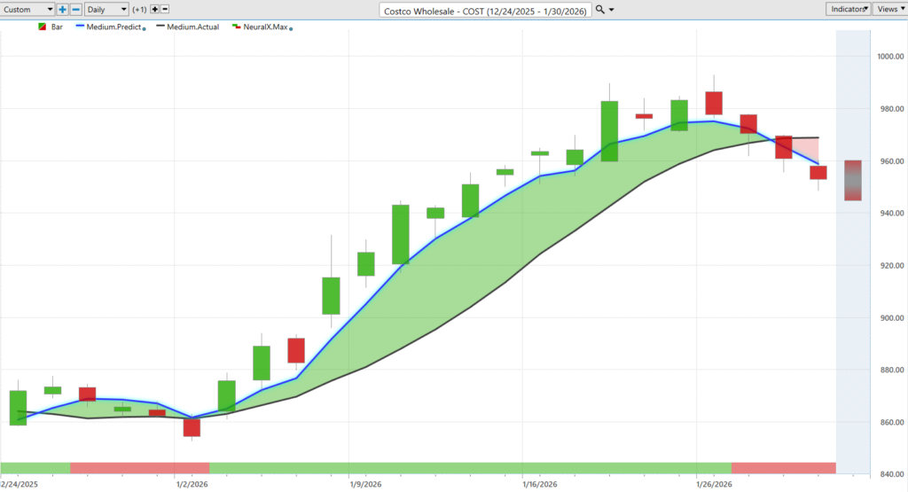 So a pretty quick rally here, shares up, let’s see, about 11, 12% just over 20 trading days, so just a few weeks of time there, market moving about 12% higher. So really nice move there in shares of Costco. And, of course, as the rally went higher, there’s these short-term trading opportunities. So if you’re buying down at these predicted lows, taking advantage of this momentum in the market, nice opportunities to pull some out of the opportunity in the trade there.