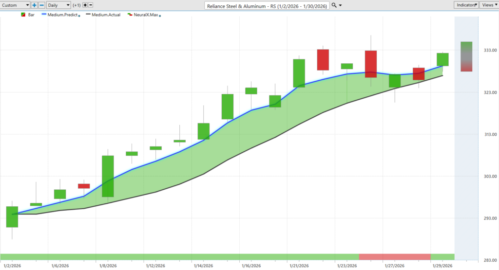 Also, the steel and aluminum markets, Reliance Steel and Aluminum ($RS), doing really well. So here we have Reliance Steel and aluminum, and it’s a really nice example here of how all of these predictive tools work together.