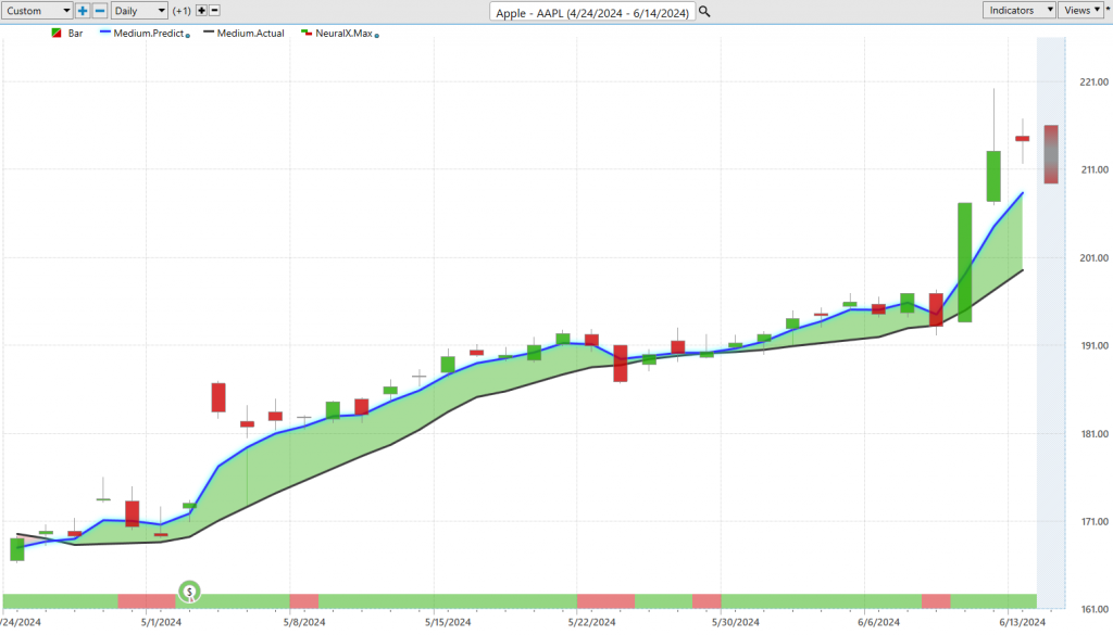 Shares of Apple ($AAPL) are another popular stock. We got this crossover all the way back at the end of April, really at the beginning of May. A very long-term opportunity as far as the crossover coming through, but again, more recently, the blue line over the black line, neural index very bullish here, and pretty much every day the trader would be coming in and saying, ‘Okay, let’s look at where we want to add to our position down at these predicted lows.’ You see in this case, the market moving down towards this previous predicted low, then all of that really strong momentum coming in as Apple does extremely well this past week along with the broader markets. We’re just seeing a lot of stocks do extremely well. This move from Apple now is about a 26.7% rally over a little bit longer period of time at 34 trading days.