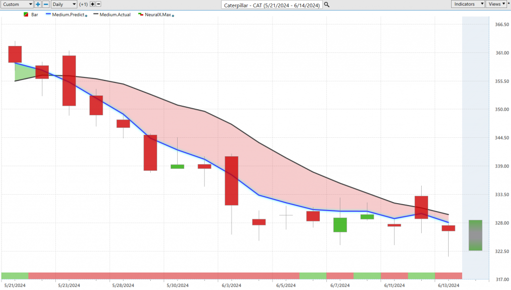 Lastly, Caterpillar ($CAT). Just wanted to highlight some of the weakness in the market. At some point, there’s going to be a blue line over the black line crossover here in Caterpillar, but certainly over this month, it is not an area where you want your attention in the marketplace. We see that crossover to the downside, neural index bearish, and all this bearish momentum taking prices materially lower. Again, you see when you get this contradiction here, the blue line below the black line, a lot of distance there, neural index bullish, and look at this week that you’ve had. Completely sideways as you’re getting that short-term strength with the neural index, but still in a downtrend. Clearly not an area that’s likely going to benefit this week as we see the broader market do well. At some point, if you want to trade Caterpillar, we’ll see those predictive indicators get bullish, and there’ll probably be some better opportunities. But an 8% slide just over the past 15 trading days is certainly not an area you want to be when we’ve got so many opportunities doing extremely well, and a lot of those Vantage Point forecast positions are to the bullish side.