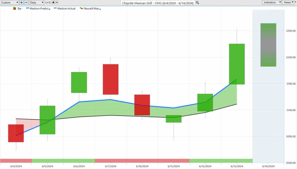 Here, shares of Chipotle Mexican Grill ($CMG) show a little bit more of a sideways beginning of a move. We see we get this crossover between the blue and the black line, and the neural index goes bearish here. This is a good example of how this all works where that neural index goes bearish, warning you to look for subsequent lower lows. Use the short-term tools if you want to keep accumulating a position, but look to do this at lower prices. You see the market wants to move lower again, forecasting that we’re going to go a little bit lower this next trading day. You get a gap down, but the overall trend is up here. The blue line is still above that black line, and we see shares begin to advance a little bit more. A 3% move just over the past week, but again, a good example. As long as that blue line remains above the black line, the neural index is going to go from bullish to bearish, but it’s going to let you know and warn you of that short-term shifting, that short-term momentum in the marketplace so you can adjust your positions.