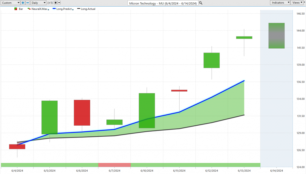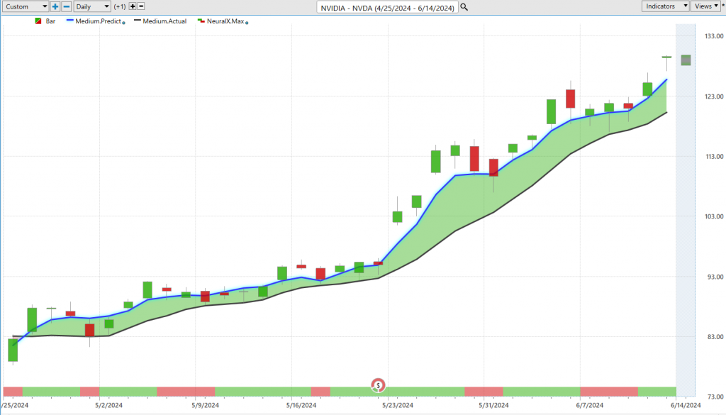 Micron Technology ($MU) is a little bit more recent of an opportunity. Micron is running sideways, but we see coming into this week, blue line over black line, neural index bullish. Again, we can take a look at really throughout the marketplace how these predicted high and low levels are performing. When you come into the week and say, ‘Okay, I want to get a position here on Micron,’ where do we want to be buying in? Coming into this trading date, let’s look to accumulate a position down here at these predicted lows. The neural index gets bearish here, letting you know to expect some potential weakness over the next couple of trading days. You run sideways, another opportunity down at that predicted low before we get all of this momentum throughout the tech space, propelling things like Micron, Apple, and certainly NVIDIA. Shares are up 8.3% just from this predicted low, which would have been Tuesday. Coming into the week, identifying all this strength, neural index bullish, we see all that momentum come through the tech space.