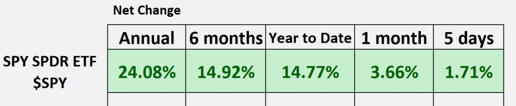 Now, as we typically do, we like to get a sense of where that broader stock market is via the SPY ETF. Right now, we can see year-to-date we’re up just under 15%, so that certainly means that there’s been nice opportunities in the first half of this year throughout the equity market. Recently, we’ve seen a lot of that momentum come into the market, so just the past five trading days are up 1.7%. This certainly means that there’s great opportunities spread throughout the marketplace.