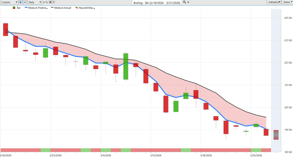 Those predicted values and the actual values. Uh, you’ll get these periods where the neural index starts flipping up to a bullish configuration. You see you get this consolidation, some gap ups and moves higher. Uh, but very clearly the market is still solidly in downtrend, not even getting close to that blue line getting above the black line. Uh, and here we see shares of Boeing down about 17, 18% just in the past 26 trading days.