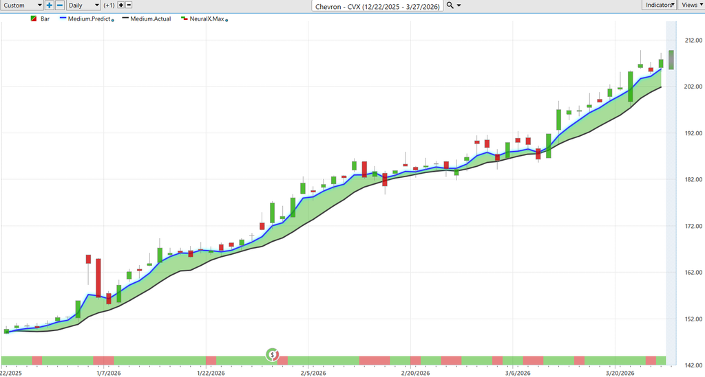 Uh, and so I won’t spend a huge amount of time on these other energy stocks, but here is Chevron. So, we looked at Chevron as well several weeks ago. Uh, and again, you see here all of the strength as far as our predicted moving average and also this neural index at the bottom. And, of course, more importantly, those predicted highs and lows. You see a very similar price action here Monday, scooting down to this predicted low. Oftentimes, I, uh, mention we see these moves on Thursday and Friday when all the price action is bullish towards the end of the week. We tend to reset going into the new week. Uh, but very clearly very bullish movements here. Uh, and even just the past couple of days, we’re moving down, this would have been Wednesday into Thursday, from predicted high to predicted low, uh, and continuing that bullish uptrend that we’re seeing across the energy space.