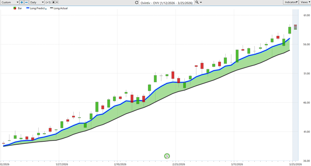 And so whenever we see that blue line cross above the black line, well, it’s suggesting, hey, these prices are going to start moving higher. Traders can look to take a long position. We see over the past 51 trading days, now oventive is up 55.6%. Uh, but more importantly, how have things shifted over the course of those 55 days? Well, this is where VantagePoint’s other predictive indicators can help solve these different problems for the trader, that being short-term strength or weakness, and also predictions for intraday highs or lows.