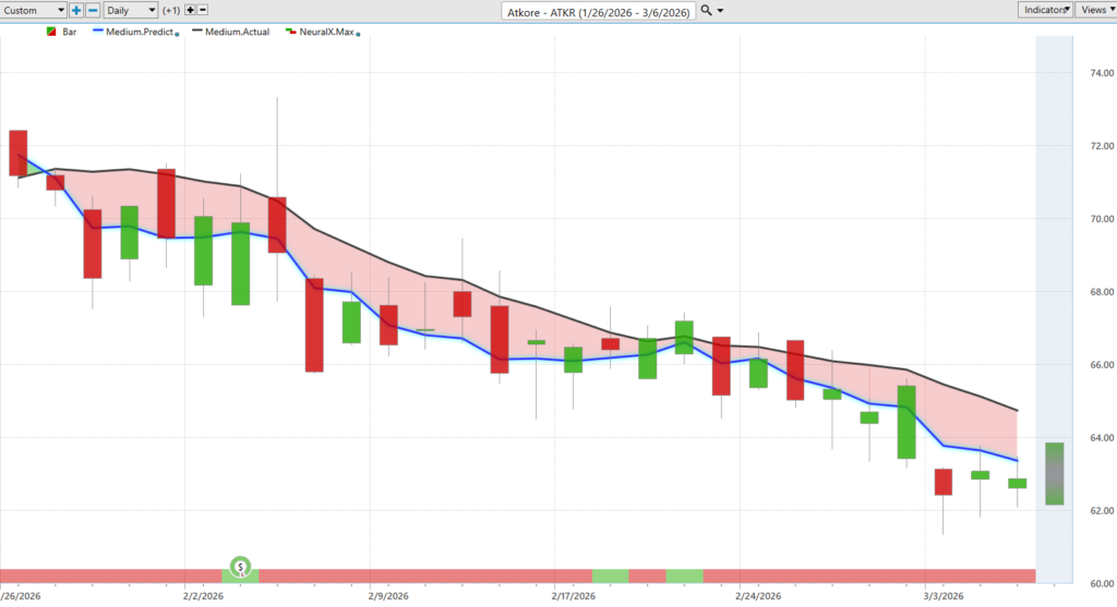 So here we see in shares of Atcore ($ATKR) shares off about 11.6% just in the past 27 trading days. And of course those predicted highs and lows again giving you really valuable levels to make trading decisions.