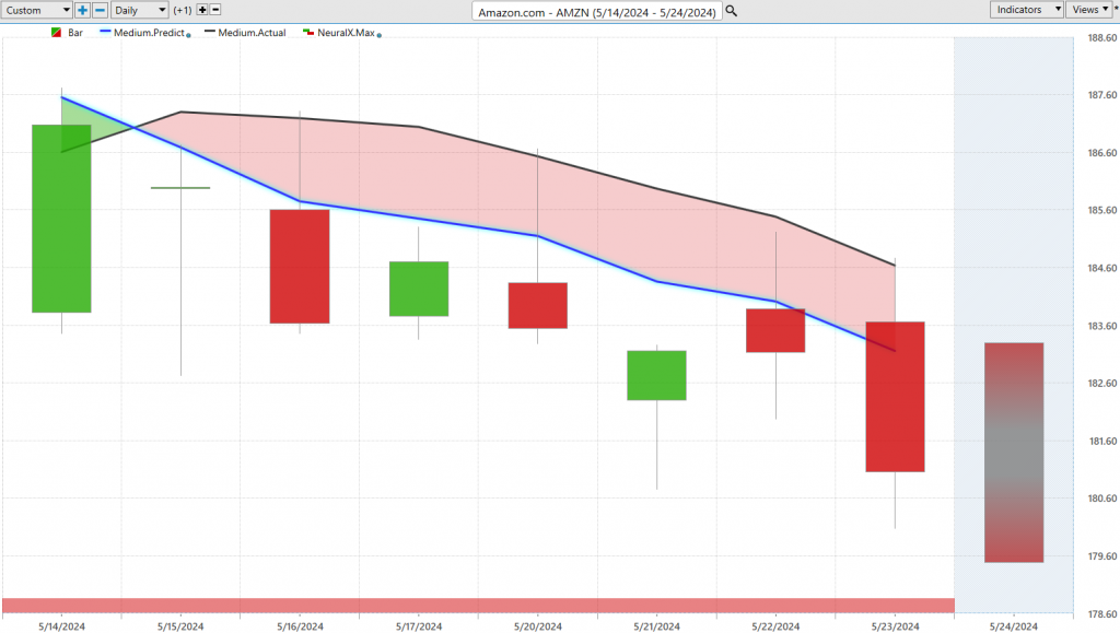 Here’s Amazon ($AMZN), again, a really popular stock. We’ve seen a lot of the broader market do well here, but Amazon‘s got something going on here. We’ve had two weeks now where the neural index has been bearish every single day. Our predicted moving average is bearish, and of course, for those really short-term traders maybe looking to trade options, here you have these levels. When you’re trading options and things like this, if you can go ahead and potentially buy those put options when you’re up at these predicted highs, it’s a great way to hedge the portfolio and make money on a potentially directional bet as we see the accuracy of these Vantage Point predictive indicators. A little decline here in Amazon shares, off about 3%, but it’s very clearly not a place you want to be when we look at some of these other opportunities opening up throughout the equity space.