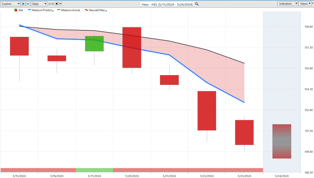 So you actually see Hess ($HES) blue line crossing below the black line, neural index bearish. Even going into the week, you can identify that, okay, well, we’re actually moving up towards these predicted highs and failing. You’ve seen that the previous few days here, Tuesday, Wednesday, Thursday, seeing energies go lower, in this case Hess stock go lower. Again, a very interesting clue that this may be why you’re seeing bullishness broadly across stocks but some things turning lower. We’re seeing risk off, or risk on in a way, like gold’s easing, commodities are easing, and certain stocks are going to do real well there. About a 5% decline here just in the past six trading days. So clearly, semiconductors is a place to be, energy on the stock side a lot more dangerous here.