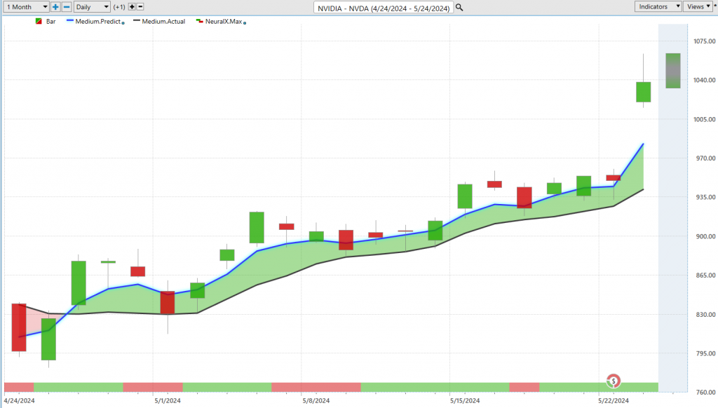 It takes this global approach to understand specifically what are the drivers affecting future prices in NVIDIA, and then it summarizes that with the help of these predictive indicators. It’s taking this global approach, looking at all these intermarket relationships, and that’s essentially the datasets that are being plugged into these neural networks to solve some of these difficult trading problems. Whenever we see this blue line cross above the black line, it’s suggesting average prices are starting to move higher. This is where, when we can get a jump on prices and get involved in trends early, it can make all the difference. So whenever that blue line crosses above the black line, it’s suggesting average prices are going to start moving higher and you might want to start executing those bullish strategies. So, we see here in the past 20 days we’ve gotten a 22, almost 23% advance in shares of NVIDIA, but that’s not it here, right? So, yeah, there’s been a nice move over 20 days, but how are things changing day-to-day for the trader and affecting their analysis?