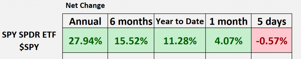 Now, as we typically do, we like to take a look at the SPY ETF to get a sense of where that broader equity market has been. The things that really stand out here, as we can see year to date, are that we’re up a little over 11%. We’ve actually seen certain markets get a little toppy here, and so this is where the short-term predicted forecast from Vantage Point is really helpful to help traders hedge, get in front of some of these big trend shifts, and take advantage of some of these really nice opportunities in the equity space.