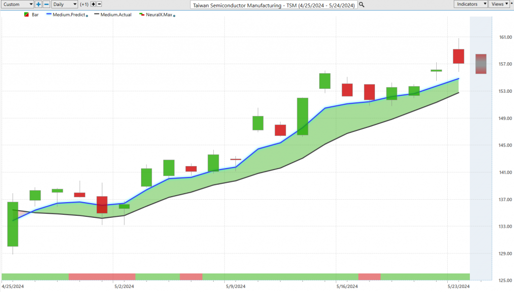 Last week we looked at Taiwan Semiconductor Mfg. ($TSM). These semiconductor stocks are getting on the radar. Tech as well. Here you see that blue line crossing above the black line again, similar price action with that neural index getting bearish and seeing some subsequent sideways price action. But let’s look at how accurate again these predicted highs and lows are. When you understand that something’s going on in tech stocks and semiconductors, we’ve got these predicted moving averages on TSM, on NVIDIA, on the bullish side. Intraday, remember you’re provided these predicted high and low levels before the trading date even occurs. Like you see in this instance, it’s a shadow candle. The actual trading day will fill in when we get the real trading market data here, and we’ll see how accurate all of those previous predictions are. But what we can see is that, okay, over the past few weeks here now, as far as stocks, where has it been saying we want to accumulate a position in this individual stock and benefit as things appreciate here? Very similar move again. We’re seeing a lot of the semiconductors have a very similar move because they share those intermarket relationships. In the same way that we can get clues on where NVIDIA is heading by price action in TSM, it goes back and forth. They really divulge some of this useful price information that the neural networks can pick up on.