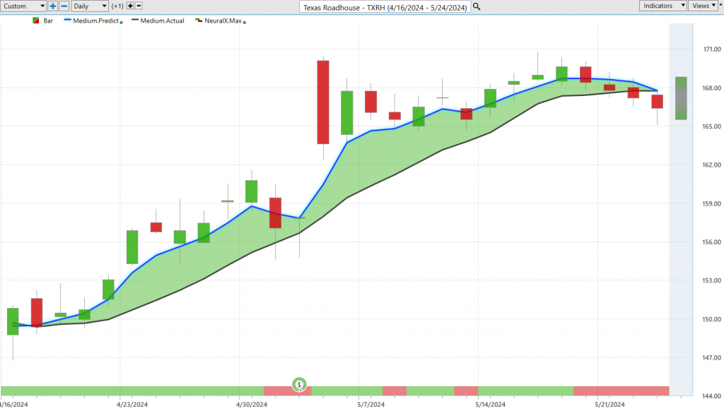 Here’s Texas Roadhouse ($TXRH). One of the few restaurant stocks where we’ve seen the blue line over the black line, neural index very bullish here. But this is what I mean by this recent weakness that we’re starting to see. There were some reasons why it looked like, okay, well up towards the predicted highs on Monday and Tuesday, we might see some weakness here. You actually see this blue line getting very close to the black line, neural index very bearish here for the week. Of course, highlighting that at least in the very short term, you can look for cheaper prices here in Texas Roadhouse. We can look at those predicted highs and lows and see a lot of noise around these earnings, but again, very clearly, you want to be a buyer taking profits on long positions. I actually want to point this out. There’s a lot of noise around earnings here, but you see this a lot where this is a Thursday, that’s a Friday, volatility coming into the beginning of the week, and then the overall trend playing out. We see that a lot where it looks like this level doesn’t hit because all the price actions gaps up and bullish, but it’s just frothy price action. These levels become relevant, and they’re important to have again on your radar and understand that they’re there. We see some of this weakness coming in, and the market again moving down towards these predicted lows. So, really nice opportunity here in shares of Texas Roadhouse. We see overall, again, this very similar move, but identifying where are those markets where we’re seeing strong uptrend, strong neural index, that’s where you want to be involved. You see about a 12% pop in the stock.